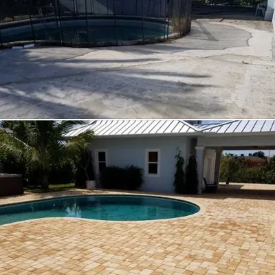Before and after photo of brick pool deck pavers