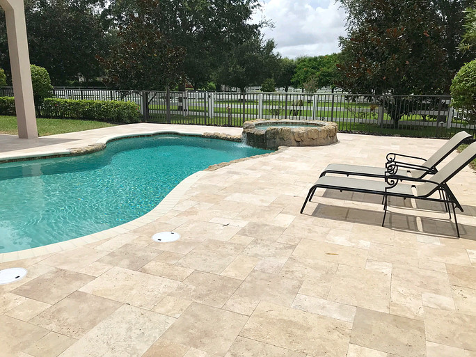 Travertine pavers come in a variety of earthy colors great for patios, poolscapes, and driveways. Travertine is porous with a matte finish, making it more slip-resistant than marble. However, this can make it susceptible to staining and scratches.